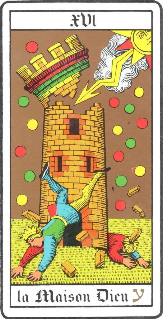 O ocultista Niemeyer assinou muitas obras, entre elas a Sede do Partido Comunista Francês [IMAGEM 9], enquanto estava exilado na França, e a Sede das Nações Unidas, em NY [IMAGEM 10]. O interessante na arquitetura dos dois edifícios é a quantidade de colunas utilizadas: 16 (no Palácio da Alvorada existem 16 com design completo, não contando as outras que representam a metade do desenho). É interessante a “coincidência” da simbologia e da ligação com o arcano 16 do Tarot (aqui vou utilizar como referência a carta da Torre, ou Casa de Deus do Tarot de Oswald Wirth, IMAGEM 11]). Na carta a representação simbólica principal é a torre sendo derrubada pelo raio solar (lembrem aqui da referência da música Thunderstruck, já citada), é a Torre de Babel, como na Bíblia e no Filme Metropolis. O topo da torre, que parece uma coroa assim como o da Catedral de Brasília representa o desafio do homem a Deus e as duas pessoas caindo representam a queda dos dragões (Lúcifer): azul coroado e consciente e vermelho sendo atingido por um tijolo que faz com que perca a consciência, atordoado, Thunderstruck. Vista de cima, a Catedral também simboliza o sol (a figura do ponto dentro do círculo ou VITRIOL – V.I.T.R.I.O.L. é a sigla da expressão, do latim “Visita Interiora Terrae, Rectificando, Invenies Occultum Lapidem”, que quer dizer: Visita o Centro da Terra, Retificando-te, encontrarás a Pedra Oculta (ou Filosofal). Filosoficamente ela quer dizer: Visita o Teu Interior, Purificando-te, Encontrarás o Teu Eu Oculto, ou, “a essência da tua alma humana”. É o símbolo universal da constante busca do homem para melhorar a si mesmo e “criar um mundo melhor”.