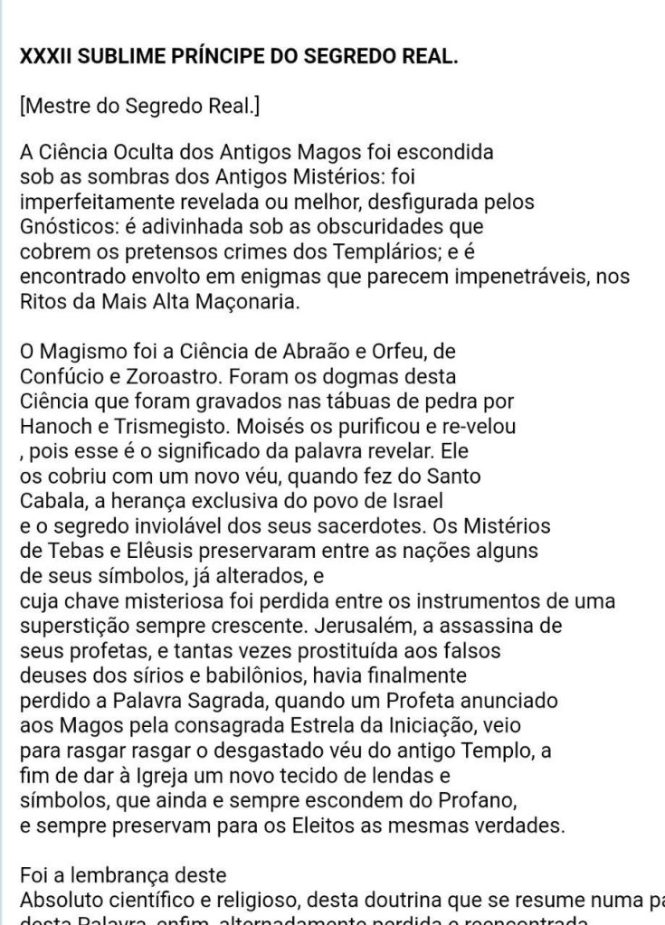 A razão pela qual os maçons empregam a linguagem autodeterminando-se “pedreiros ou construtores” é porque o seu objetivo é realizar a conclusão da “Grande Obra” (Magnum Opus), simbolizada pela reconstrução do antigo Templo de Salomão, conforme descrito na visão de Ezequial. De acordo com Morals and Dogma – a chamada “bíblia” da Maçonaria, escrita por Albert Pike – a visão foi completada no Livro do Apocalipse. No entanto, explica Pike, o poder desse livro não é encontrado na interpretação cristã convencional, mas sim no fato de ele transmitir os segredos da Cabala judaica, uma tradição mística que remonta ao século VI aC, quando o antigo culto dos moribundos – deus assimilado à magia dos Magos Caldeus da Babilônia, como fica evidenciado no 32 grau, conforme trecho de Moral e Dogma de Albert Pike [IMAGEM 2].