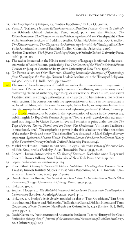 Evola foi autor de livros que cobrem temas como Hermetismo, metafísica da guerra, magia sexual, Tantra, Budismo, Taoísmo e o Santo Graal. O interesse de Evola pelo Tantra foi inspirado pela correspondência com John Woodroffe, também conhecido como Arthur Avalon. No Budismo Tântrico no Leste Asiático, Richard K. Payne, Reitor do Instituto de Estudos Budistas, argumentou que Evola manipulou o Tantra a serviço da violência da direita, conforme revelado em sua ênfase no “poder” em The Yoga of Power pois anteriormente apenas o caminho da Mão Esquerda abraça a violência como meio de transgressão. Evola afirmou que “indivíduos diferenciados” seguindo o Caminho da Mão Esquerda usam poderes sexuais sombrios e violentos contra o mundo moderno. Para Evola, estes “heróis viris” são generosos e cruéis, possuem a capacidade de governar e cometem atos “dionisíacos” (ligado ao meme do Chad Fino, representando normalmente por um Moai da ilha de Pascoa com uma taça de vinho) que podem ser vistos como convencionalmente imorais.