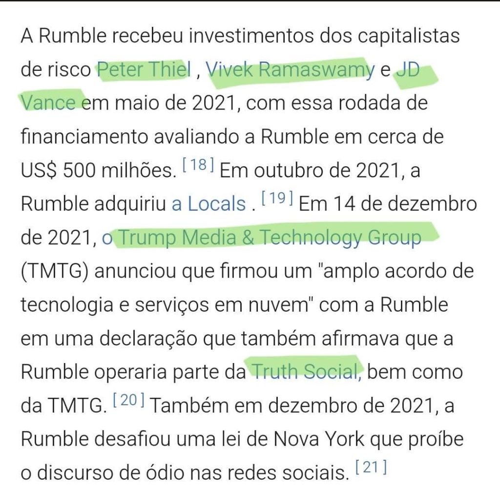 Embora pareça divertido imaginar as retaliações contra o governo brasileiro e nosso judiciário que se envolveu em polêmicas com o Musk, o cenário é preocupante. Não bastassem as bravatas do presidente Lula, da primeira dama e de vários parlamentares, o judiciário também se lambuzou. Além de imprimir censura ao Twitter e bloquear os recebimentos da StarLink, a empresa de streaming de vídeos Rumble também foi impedida de funcionar no Brasil. Como não há nada ruim que não possa piorar, a Rumble recebeu investimentos de Peter Thiel e JD Vance, atual vice presidente norte-americano, tornando-se parte do conglomerado do grupo que controla a maia poderosa nação do mundo. Em 14 de dezembro de 2021, o Trump Media & Technology Group (TMTG) anunciou que firmou um “amplo acordo de tecnologia e serviços em nuvem” com a Rumble em uma declaração que também afirmava que a Rumble operaria parte da Truth Social,rede social do Presidente norte-americano Donald Trump, bem como da TMTG.